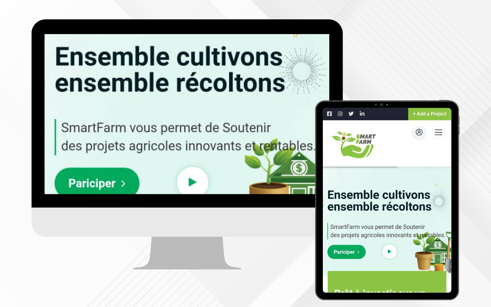 SMART FARM-Plateforme de crowdfunding La plateforme SMART FARM a été conçue pour répondre aux besoins de financement des projets agricoles à travers un modèle de crowdfunding innovant et inclusif....